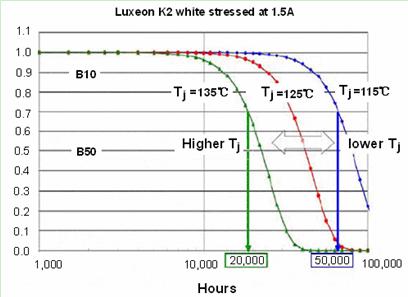不同品牌LED的光衰是不同的,通常LED廠家會給出一套標(biāo)準(zhǔn)的光衰曲線。例如Philips Lumiled公司的Luxeon K2的光衰曲線如圖1所示,當(dāng)結(jié)溫從115℃提高到135℃,其壽命就會從50,000小時縮短到20,000小時。