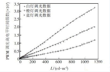 圖3為SS-230平板顯示綜合分析系統(tǒng)的照片。實(shí)驗(yàn)時(shí),調(diào)白光從低亮度到高亮度,橙燈和藍(lán)燈也按比例逐漸增加,保證色溫在(6 500±30)K,色坐標(biāo)u′=0。198,v′=0。468。記錄從低亮度到高亮度調(diào)光過(guò)程中,白燈、橙燈和藍(lán)燈的調(diào)光PWM波形高電平持續(xù)時(shí)間的數(shù)據(jù),共記錄40組數(shù)據(jù)。