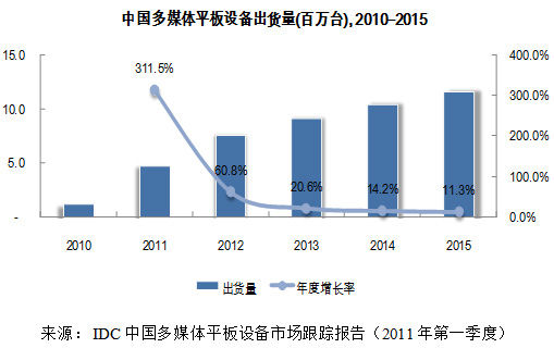 不過,第二季度隨著iPad2 供貨充足以及大量其他核心廠商的新品進入市場,IDC預計中國多媒體平板設備市場仍將保持超過40%的高速增長。該機構上調(diào)2011年度中國多媒體平板設備出貨量的預期數(shù)據(jù)至468萬臺,并預計2015年出貨量達到1154萬臺。