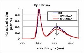 3. 光衰:這種失效系指LED發(fā)出的光強度低于新品。如前面章節(jié)所述,光衰程度已成為評判LED照明產品壽命的重要指標,所以這類失效的分析就相當重要。整體來說,本類失效的分析非常復雜,因為影響光強度的因素非常多,如chip劣化、反射杯的劣化、膠材與chip間脫層、膠材透明度下降、打線接合面電阻上升、熱阻太高等等,若發(fā)生在白光LED,則還需考慮螢光粉劣化的問題,因白光LED通常使用一或多種的螢光粉,它們會受到熱或濕氣的影響而衰減并降低效率,導致產出的光色改變。分析的手法包括有:非破壞檢測,如外觀檢查、LED電性曲線、積分球的光學特性等等,用上述數據綜合判斷,逐一排除,當推斷可能原因后,接著進行破壞性分析,利用樣品制備技術制作出適合的分析樣品,再輔以各種儀器如SAT(Scanning Acoustic Tomography)超音波掃瞄、FTIR(Fourier Transform InfraRed)傅立葉轉換紅外光譜儀、TEM(Transmission Electron Microscope)穿透式電子顯微鏡、SEM(Scanning Electron Microscope)等等加以驗證,方能到真因。