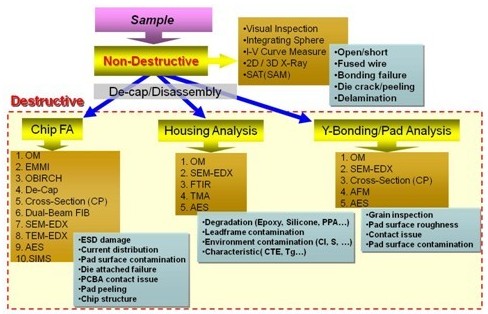 從上可知,一個LED產品的失效,起因可能來自于該產品的任何一個部份,故必須抽絲剝繭方能找到真正的失效原因。針對失效來自LED燈粒而言,因完整的LED燈粒中,LED chip本身很強壯,但包復chip的封裝材料則易遭受損傷,因此,LED燈粒的失效多可歸因于封裝材料的破壞或劣化所導致。若要充分解析這類失效,牽涉到光學、化學、材料學、電子物理學等領域的專業(yè)知識,并搭配精密的儀器與豐富的實務經驗,才能確認失效點并推導真因,進而提出改善對策。