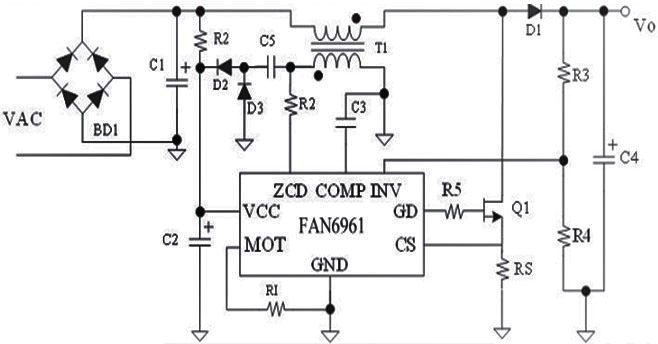 Boost變換器的控制芯片為FAN6961,需要一輔助繞組,根據(jù)FAN6961的使用說明可知其匝數(shù)由式(5)決定: