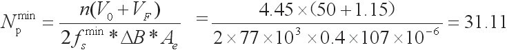 變壓器的磁芯選擇為EER3542(Ae=107mm2)磁芯,從圖7所示的增益曲線得到最小開關頻率為77kHz,則變壓器的初級最小線圈數(shù)為: