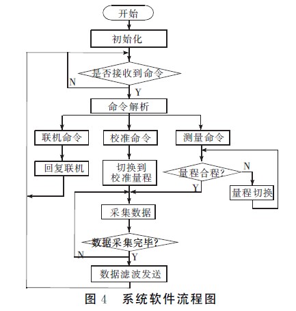 系統(tǒng)軟件采用C語言編寫,在IAR公司提供的集成調(diào)試環(huán)境Workbech下采用模塊化思想進行設(shè)計。系統(tǒng)的軟件程序固化在MSP430F149單片機的內(nèi)部Flash存儲器中。系統(tǒng)的程序流程如圖4所示。整個流程可分為初始化、命令解析、數(shù)據(jù)測量、數(shù)據(jù)處理及顯示程序。程序設(shè)計借鑒實時操作系統(tǒng)的思想,劃分事件和目標(biāo)。系統(tǒng)按照工作過程共有命令解析、聯(lián)機、校準(zhǔn)、測量判斷、數(shù)據(jù)采集、數(shù)據(jù)打包發(fā)送等幾個事件,通過對事件的處理來完成相應(yīng)的功能,并進行必要的狀態(tài)轉(zhuǎn)換。當(dāng)電壓改變后,接收到測量命令,進入測量狀態(tài),將數(shù)據(jù)發(fā)送并顯示,回到空閑狀態(tài)繼續(xù)等待命令然后進行相應(yīng)的操作。