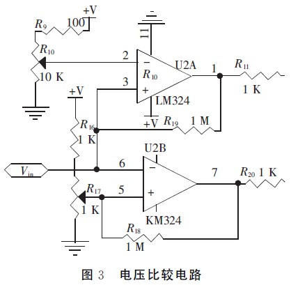 放大后的電壓Vin分別輸入單片機A/D通道和由LM324組成的上下限電壓比較器,根據(jù)比較器輸出分析信號幅度是否在規(guī)定范圍內(nèi)。為了使電路工作更穩(wěn)定,比較電壓值需預(yù)留一定的豁量。如圖3所示,調(diào)節(jié)R10使比較上限電壓為2.3V,調(diào)節(jié)R17使比較下限電壓為0.1V,當(dāng)Vin在0.1~2.3V時,量程合適,比較器輸出邏輯電平00,啟動A/D轉(zhuǎn)換電路。否則,當(dāng)Vin>2.3V時,通過模擬開關(guān)MAX312并配合軟件來切換I/V轉(zhuǎn)換電路的反饋電阻,向大量程切換;當(dāng)Vin<0.1V時,向小量程切換,以適應(yīng)不同強度的光信號。