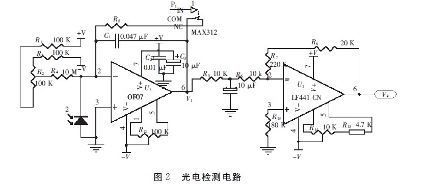 亮度測量電路由I/V轉(zhuǎn)換電路和二級放大電路組成。OLED器件發(fā)出的光入射到光敏二極管GT101,輸出僅0.002~200μA 的電流信號,I/V轉(zhuǎn)換電路器件選用具有極低輸入偏置電流的單片電路靜電計型運算放大器OP07.OP07具有低輸入電流和低輸入補償電壓,因此適合作為非常敏感的光敏二極管的前置放大器。如圖2所示,通過調(diào)節(jié)R12可將運放的失調(diào)調(diào)零,R2補償集成運放的偏置電流。