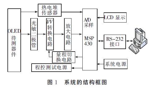 系統(tǒng)總體框圖如圖1所示。系統(tǒng)由上位機和下位機兩部組成。下位機以MSP430F149微控制器為核心,包括可編程直流電源IPD-3303SL、光電轉(zhuǎn)換電路、溫度測量電路、量程切換電路、顯示電路以及RS232接口電路;上位機為通用的PC機,配以專用數(shù)據(jù)處理軟件完成系統(tǒng)數(shù)據(jù)處理和光電性能分析等功能。