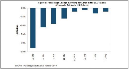 據(jù)IHS iSuppli公司的液晶顯示器(LCD)價格研究報告,8月份大尺寸LCD面板價格下降速度預計略慢于7月,供應商積極降低產(chǎn)能利用率預計會防止面板價格進一步下滑。
