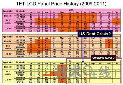 日本高級(jí)數(shù)據(jù)研究機(jī)構(gòu)首席執(zhí)行官高多清作就持這種觀點(diǎn)。2008年美國(guó)金融危機(jī)時(shí),他對(duì)TFT-LCD面板價(jià)格做出了下降走勢(shì)的準(zhǔn)確判斷,因此,他對(duì)預(yù)計(jì)本次美國(guó)債務(wù)危機(jī)期間的TFT-LCD面板價(jià)格仍會(huì)繼續(xù)走低非常自信(見圖1)。