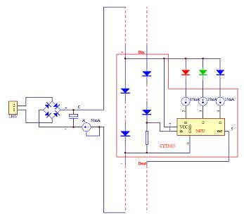 壓階傳輸,前面已經(jīng)提到過了,它是一種高電壓低電流的傳輸方式,數(shù)據(jù)和供電都是工作在一個個臺階(壓階)上。那么怎么樣才能將LED全彩驅(qū)動IC從低壓大電流的方式轉(zhuǎn)換到高壓低電流的壓階傳輸方式?我們就在CYT3005單總線傳輸?shù)幕A(chǔ)上,進(jìn)行壓階傳輸設(shè)計,如圖二所示。