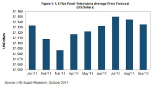IHS公司預(yù)測,電視轉(zhuǎn)播橄欖球賽季,以及年底假日銷售季促銷活動開始,預(yù)計未來幾個月電視價格將會下降,零售商可能出清庫存,準備進貨2012年新款產(chǎn)品。在經(jīng)濟不景氣之際,美國市場對價格仍然高度敏感,品牌廠商可能極其重視質(zhì)量和創(chuàng)新,以此來打敗競爭對手。