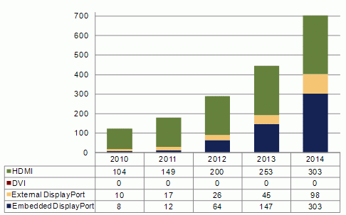去年In-Stat 觀察到HDMI在移動(dòng)消費(fèi)性裝置上有快速成長(zhǎng),例如手持式高清攝影機(jī)、數(shù)碼相機(jī)等。而在電腦的部分,今年起HDMI在移動(dòng)電腦 (包含筆記本電腦、上網(wǎng)本和平板電腦等)、繪圖卡、以及電腦顯示器等等的搭載比重正不斷攀升。根據(jù)In-Stat最新的PC/Display Interface By Device, Q4’11 Forecast (電腦與顯示器接口統(tǒng)計(jì)數(shù)據(jù)庫與預(yù)測(cè))報(bào)告指出,2011年搭載有HDMI接口的移動(dòng)電腦的數(shù)量為1億4千8百萬臺(tái)(包括筆記本電腦、上網(wǎng)本和平板電腦等),相較于2010年的1億零3百萬臺(tái)的出貨成長(zhǎng)了43%;而在移動(dòng)電腦不斷強(qiáng)調(diào)高分辨率多媒體數(shù)字娛樂播放的趨勢(shì)之下,預(yù)計(jì)2014年搭載有HDMI接口的移動(dòng)電腦的數(shù)量將可達(dá)3億臺(tái)以上。另外,Embedded DsiplayPort的接口成長(zhǎng)亦十分快速,搭載有Embedded DisplayPort的移動(dòng)電腦裝置預(yù)計(jì)將由2010年的8百萬個(gè)快速成長(zhǎng)到2014年的3億個(gè)以上。