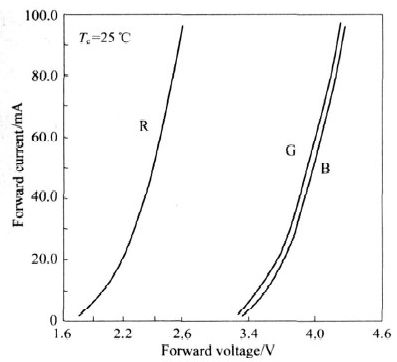 圖1 和圖2 反映了一組R、G、B 3 種LED 的正向電壓VF與正向電流IF 以及IF 與亮度L 間的關(guān)系??梢钥闯?超過門限電壓后,隨著VF 的增加, IF 先是緩慢增加而后便急劇增加。