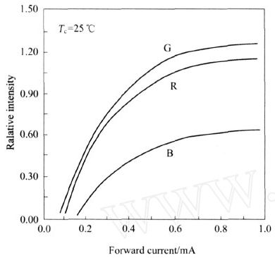 從圖2 的IF 與L 曲線可知, IF 的大小直接影響了L 。當(dāng)IF 達(dá)到一定值以后,L 基本趨于飽和。根據(jù)圖1 和圖2 的VF 、IF 和L 特性,在實際中通常用VF 的方式驅(qū)動LED ,用串連電阻值的大小調(diào)整LED 的RGB 三基色的IF 使其L 一致。而系統(tǒng)對RGB 三基色的IF 的調(diào)整,是以常溫為基本的標(biāo)準(zhǔn)。