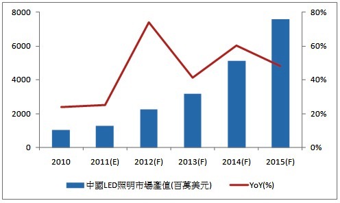 LEDinside統(tǒng)計(jì)2010年中國(guó)照明市場(chǎng)規(guī)模為122億美元(不含車用照明),其中 LED照明產(chǎn)值達(dá)到10.3億美元,未來(lái)幾年仍呈現(xiàn)明顯的成長(zhǎng)。LEDinside預(yù)估,未來(lái)透過(guò)補(bǔ)貼政策與白熾燈泡禁用政策的推波助瀾下,中國(guó)LED照明市場(chǎng)規(guī)模至2015年將達(dá)到76億美元,躍身成為全球前三大LED照明市場(chǎng)之列,身兼生產(chǎn)與消費(fèi)大國(guó)雙重角色,也成為國(guó)際廠商與本土照明廠商的最重要市場(chǎng)之一。