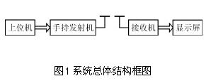 整個(gè)系統(tǒng)由三個(gè)相對(duì)獨(dú)立的子系統(tǒng)組成,即上位機(jī)、手持發(fā)射機(jī)、接收機(jī)和顯示屏系統(tǒng)。其結(jié)構(gòu)框圖如圖1所示。