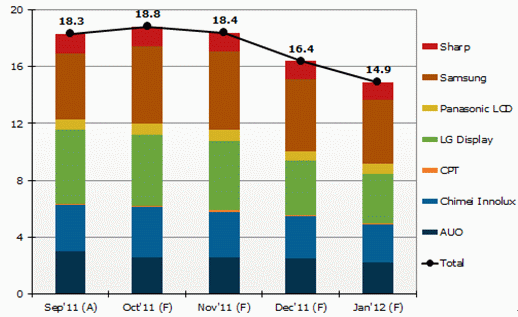 圖一、Sep’11-Jan’12各面板廠商液晶電視面板出貨計(jì)劃(單位:百萬片)
