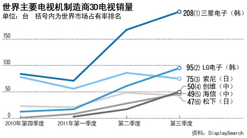 據(jù)市場(chǎng)調(diào)查機(jī)構(gòu)Display Search 20日公布的《第三季度世界3D電視銷量》顯示,中國(guó)有4家企業(yè)進(jìn)入前十,分別是創(chuàng)維(50萬(wàn)臺(tái),第4位)、海信(49萬(wàn)臺(tái),第5位)、長(zhǎng)虹(34萬(wàn)臺(tái),第7位)、康佳(27萬(wàn)臺(tái),第9位)。