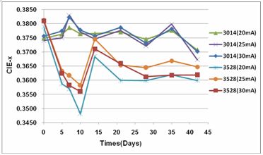 隨機(jī)抽取3528LED和3014LED各30pcs,按驅(qū)動(dòng)電流20mA、25mA、30mA各分為三組進(jìn)行1008H的光衰實(shí)驗(yàn),以比較分析兩種不同散熱模式LED的光衰和色坐標(biāo)漂移程度,從而研究散熱對(duì)其光色特性的影響。