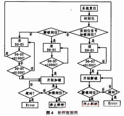 當信號D0-D5為10000時,單片機通過P10口對方位鎖定機構(gòu)發(fā)出加鎖命令,控制命令經(jīng)SN54LS245驅(qū)動后作用于R9和VQ1,VQ1導通后,繼電器K2的4、5導通,輸出+28 VLOCK信號控制電機進行加鎖。完全鎖定后,光電開關輸出(上)信號輸出高電平即圖3中STOP+,STOP+通過上拉電阻R16作用于R10和VQ2,VQ2導通后,繼電器K3的4、5和8、9導通,+28 V LOCK信號切斷,硬件上先停止加鎖控制,防止造成機構(gòu)硬件損傷。而K3的8、9導通后,F(xiàn)WH+輸出+5 V電平給單片機,單片機接收信號后,終止加鎖命令,VQ1截止,K3恢復常態(tài)。解鎖過程和加鎖過程類似,在此不作贅述。
