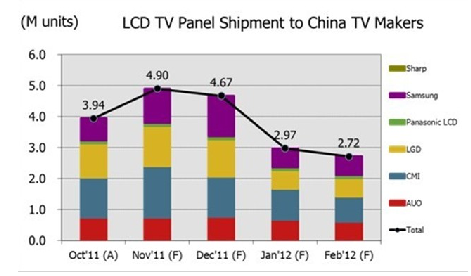 就總體液晶電視面板出貨而言, 預(yù)估向中國(guó)大陸本土廠商11月出貨量較上月成長(zhǎng)24%, 12月較11月下降5%; 而到2012年1月, 面板出貨數(shù)量將大幅度下滑至不足300萬(wàn)片, 較12月下降達(dá)到36%。