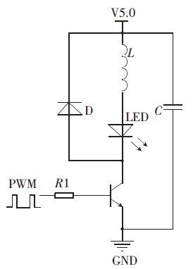 圖1 所示為驅(qū)動電路, 電感值的選擇以及PWM 波的頻率選擇在此驅(qū)動電路中相當重要。選擇C8051330 芯片作為PWM 波的輸出, 采用定時器翻轉(zhuǎn)控制高低電平的時間,從而控制PWM 波的占空比。