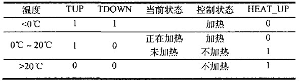 當(dāng)環(huán)境溫度低于0℃ ,此時TUP與TDOWN均為高電平,F(xiàn)PGA/CPLD輸出高電平HEAT_UP,加熱電路工作。當(dāng)環(huán)境溫度介于0℃與20℃之間時,如果此時正在加熱,則繼續(xù)加熱,如果當(dāng)前未加熱,則無需加熱。當(dāng)環(huán)境溫度高于20℃時,則停止加熱。