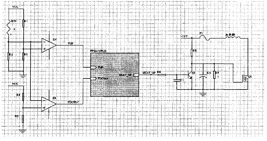 加熱電路包括FPGA/CPLD、溫度傳感器、比較器、加熱控制開關(guān)、加熱器件等,電路圖如圖1。