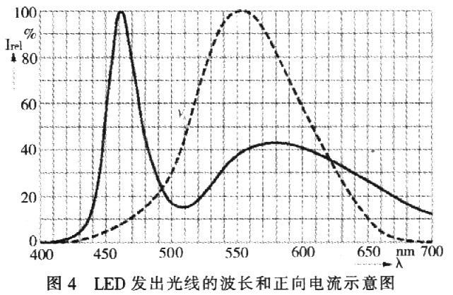 白光LED設(shè)計中采用了一個小竅門。在發(fā)射藍光的InGaN基料上覆蓋轉(zhuǎn)換材料,這種材料在受到藍光激勵時會發(fā)出黃光。于是得到了藍光和黃光的混合物,在肉眼看來就是白色的,圖4為LED發(fā)出光線的波長和正向電流示意圖。由圖4可以看出:白光LED的發(fā)射波長(實線)包括藍光和黃光區(qū)域的峰值,但是在肉眼看來就是白色。肉眼的相對光敏感性(虛線)如圖4所示。