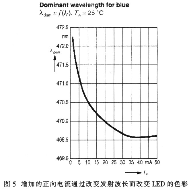 但是,采用InGaN技術(shù)的LED并不像標準綠光、紅光和黃光那樣容易控制。InGaN LED的顯示波長(色彩)會隨著正向電流而改變(如圖5所示)。例如,白光LED所呈現(xiàn)的色彩變化產(chǎn)生于轉(zhuǎn)換材料的不同濃度,且藍光發(fā)光InGaN材料隨著正向電壓的變化而產(chǎn)生波長變化。