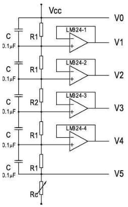 在圖1中,在各輸出端增加了運算放大器LM324。LM324是一個具有四運放的可使用正負電源工作的運算放大器。它的每一個運放都接成電壓跟隨器的形式,使得V1、V2等輸出端的驅(qū)動能力大大增強,可以大大改善LCD的對比度。電路中的Rc為10~20kΩ的可變電阻,在模塊對外部的接口處引出,可以隨時調(diào)整顯示的對比度。