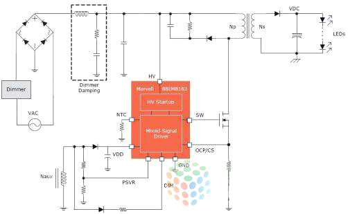 消費(fèi)者用LED節(jié)能燈取代白熾燈等傳統(tǒng)照明解決方案的同時(shí),也希望得到同樣或更好的照明體驗(yàn)。不幸的是,他們常常發(fā)現(xiàn)LED燈在調(diào)光能力上有問題,因此覺得LED燈幾乎不能調(diào)光或調(diào)光時(shí)會(huì)閃爍。很多LED燈與家中已安裝的壁式調(diào)光器也不兼容。Marvell最新的88EM8183深度調(diào)光單級(jí)交流/直流 LED驅(qū)動(dòng)器IC為OEM廠商和ODM廠商提供了兼容性最廣泛的調(diào)光解決方案,該IC與全球市場上絕大多數(shù)調(diào)光器都兼容,而且提供卓越的光輸出質(zhì)量,可提高消費(fèi)者的滿意度,減少退貨。