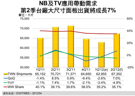 2012年第2季臺廠大尺寸(9寸以上)TFT LCD面板總出貨量將為6,735.2萬片,較前一季增加7%,但較2011年同期則減少4.8%,DIGITIMES Research資深分析師兼副主任黃銘章分析,主要原因?yàn)椴示Ъ叭A映相繼地淡出大尺寸面板市場,2011年華映的各類NB面板出貨達(dá)到664萬片,但2012年將降至不足100萬片。因此,預(yù)期臺廠佔(zhàn)全球出貨量比重在第2季仍將微幅下跌0.1個(gè)百分點(diǎn)至35.1%。