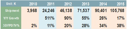 據(jù)NPD DisplaySearch調(diào)查液晶電視自2010年起開始走向3D影像應(yīng)用,并且不同品牌間在發(fā)展3D技術(shù)上存在差異。但不論是快門式或偏光式,消費者對3D電視的接受度還有待考量,市場上仍然不能說已經(jīng)獲得了成功。2011年3D電視總出貨量約達2千4百萬臺,相較2億臺以上平板電視(包含液晶電視和等離子電視)的總出貨量而言,滲透率僅約11%,但成長率卻高達511%。比起2010年品牌間對3D技術(shù)的激烈攻防戰(zhàn),2011年的3D電視戰(zhàn)爭少了些硝煙味,特別是三星將主力放在智能電視,樂金持續(xù)對薄膜式3D電視加碼促銷,并與中國品牌達成聯(lián)合戰(zhàn)線,將薄膜式3D技術(shù)的市場占有率逐漸提高。