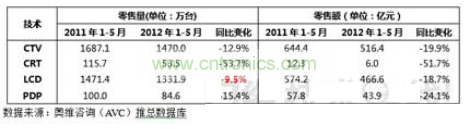 2012年1~5月彩電市場量額齊跌,液晶電視銷量同比下降9.5%。視像協(xié)會與AVC聯(lián)合發(fā)布的數(shù)據(jù)顯示,1-5月彩電內(nèi)銷量為1470萬臺,同比下降12.9%;銷售額516.4億元,同比下降19.9%。其中,液晶電視1331.9萬臺,同比下降9.5%,銷售額為466.6萬元,同比下降18.7%。(見圖1)