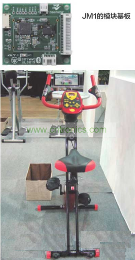 安裝了Aplix開發(fā)的通信模塊“JM1”的訓(xùn)練機。是該公司用于演示的試制品。訓(xùn)練機的動作數(shù)據(jù)將發(fā)送到智能手機和平板終端,實現(xiàn)了與Web服務(wù)等聯(lián)動的功能。