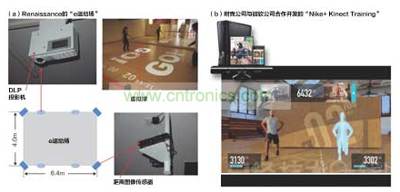 (a)是Renaissance經(jīng)營的健身俱樂部設(shè)置的“e運動場”。使用投影儀把游戲畫面投影投影到訓(xùn)練館中,用戶親身參與其中。人體動作使用距離圖像傳感器獲取。照片上是2位運動員相對而立,向?qū)Ψ角蜷T射出虛擬球的“空氣曲棍球”游戲。(b)是耐克公司與微軟公司合作為“Xbox 330”開發(fā),支持Kinect的健身軟件“Nike+Kinect Training”的畫面示例。該軟件將檢測身體的動作,為目標(biāo)提供有效訓(xùn)練方式。