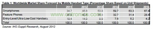 今年智能手機(jī)出貨與與市場份額強(qiáng)勁擴(kuò)張,將首次成為領(lǐng)先的手機(jī)類型,而且未來幾年出貨量將保持兩位數(shù)的增長速度。到2016年,智能手機(jī)將占總體手機(jī)市場的67.4%,如表1所示。