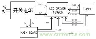 電視顯示系統(tǒng)包括電源板、主板、背光驅(qū)動板等, 電源板提供VLED、12V給背光板,主板提供背光控制信號BL_ON和調(diào)光PWM信號給背光板。背光驅(qū)動ICOZ9906 檢測PANEL內(nèi)部五條燈條的流過的電流,進行定電流和電流平衡控制,點亮背光系統(tǒng)。