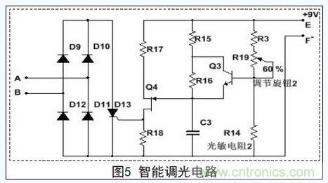 當(dāng)LED照明設(shè)備開(kāi)始工作后,本文設(shè)計(jì)的智能開(kāi)關(guān)會(huì)依據(jù)環(huán)境照明情況的變化,通過(guò)智能調(diào)光電路自動(dòng)地改變照明設(shè)備的亮度。圖1所示的智能調(diào)光電路接口A、B接入的電路如圖5所示。
