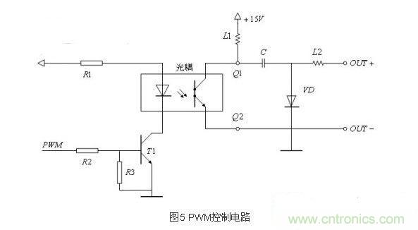 限于篇幅有限,下面僅對此PWM控制電路進行簡單的介紹:當(dāng)PWM控制信號為低電平時,晶體管T1處于截止狀態(tài),光電耦合器中發(fā)光二極管的電流近似為零,輸出端Q1和Q2間的電阻很大,相當(dāng)于開關(guān)“斷開”;當(dāng)PWM波控制信號為高電平時,晶體管T1處于導(dǎo)通狀態(tài),光電耦合器中發(fā)光二極管發(fā)光,輸出端Q1和Q2間的電阻很小,相當(dāng)于開關(guān)“導(dǎo)通”.由上面介紹可知,當(dāng)DS18B20采集的實時溫度小于制冷啟動溫度時,光電耦合器的PWM輸入端無信號輸入時,光電耦合器處于不工作狀態(tài),圖5中的OUT+端和OUT-端無輸出電壓,即半導(dǎo)體制冷片處于閑置狀態(tài);當(dāng)DS18B20采集的實時溫度大于制冷啟動溫度時,光電耦合器的PWM輸入端有信號輸入,圖5中的OUT+端和OUT-端即有輸出電壓。通過PWM調(diào)制波控制Q1和Q2兩端的通斷,即可實現(xiàn)對半導(dǎo)體制冷片TEC工作電壓的控制,進而控制了半導(dǎo)體制冷片TEC的散熱功率。圖5中的OUT+端和OUT-端分別接在半導(dǎo)體制冷片TEC的輸入端線上。根據(jù)CUK電路的輸出電壓和供電電源電壓的關(guān)系,可得出PWM波占空比和半導(dǎo)體制冷片TEC輸入電壓的關(guān)系: