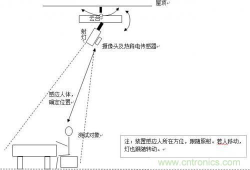 模型設(shè)計為,在一個房間的天花板處安裝此系統(tǒng),當(dāng)一個人進(jìn)入房間時,系統(tǒng)可以自動識別有人進(jìn)入房間,led射燈打開并照亮人所在位置(及其周邊一定區(qū)域);當(dāng)人在房間里移動時,位于系統(tǒng)云臺上射燈發(fā)射的燈光會跟隨人體運(yùn)動。