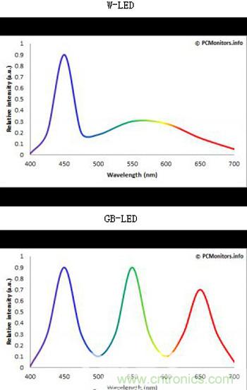 不管是投影儀還是電視機(jī)都采用的是RGB-LED光源,也就是紅黃藍(lán)三色LED光源,而這3種顏色的LED,以“藍(lán)光LED”最為重要,減弱藍(lán)光則會使色彩失真,整體畫面色調(diào)偏紅黃。一起看看LED顯示器兩種主要發(fā)光模塊W-LED(常用)和GB-LED的光譜組成。如下圖: