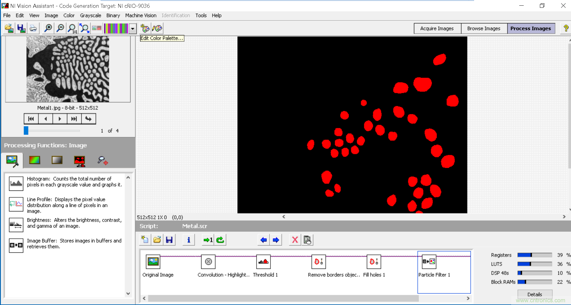 為了實(shí)現(xiàn)生產(chǎn)率的最大化,不論使用哪種處理平臺,都需要立即獲得關(guān)于算法的反饋和基準(zhǔn)測試信息。當(dāng)使用迭代探索性方法時,實(shí)時查看算法結(jié)果將會節(jié)省大量時間。什么是正確的閾值?用二進(jìn)制形態(tài)濾波器剔除的顆粒多大或多小?哪種圖像預(yù)處理算法和算法參數(shù)可以最好地清理圖像?這些都是開發(fā)視覺算法時的常見問題,而關(guān)鍵在于是否能夠更改并快速查看結(jié)果。然而,傳統(tǒng)的FPGA開發(fā)方法可能會減緩創(chuàng)新,因?yàn)樗惴ǖ拿總€設(shè)計變化之間需要編譯時間??朔@一點(diǎn)的一個方法是使用一個算法開發(fā)工具,可讓您在同一個環(huán)境進(jìn)行CPU和FPGA的開發(fā)工作,而不會在FPGA編譯時陷入困境。NI Vision Assistant是一種算法工程工具,用于開發(fā)部署到CPU或FPGA上的算法,以幫助您簡化視覺系統(tǒng)設(shè)計。您還可以使用Vision Assistant在目標(biāo)硬件上編譯和運(yùn)行之前測試算法,同時輕松訪問吞吐量和資源利用率信息。
