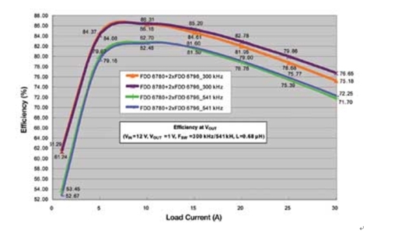 注意上面的兩條曲線,在滿載(30A)時(shí),可以看到最新的器件的效率有1.5%的改進(jìn)。同樣還是這兩條曲線,在負(fù)荷較小(15A)時(shí),可以實(shí)現(xiàn)0.69%的改善。如果對(duì)整個(gè)負(fù)荷范圍積分,那么與今天常見(jiàn)的方案相比,使用最新的MOSFET器件時(shí)平均功率損耗可以降低8%~10%。即使在較高的開(kāi)關(guān)頻率541kHz處,可以看到在負(fù)荷小時(shí)系統(tǒng)級(jí)效率仍然高于80%,而在滿載時(shí)效率大于70%。如果頻率繼續(xù)增加,那么開(kāi)關(guān)損耗將急劇增加。