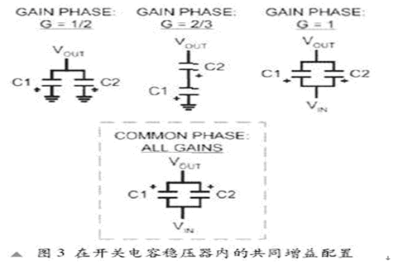 開關電容穩(wěn)壓器的更多增益可能會增加一點點效率,但是卻要增加更多外部電容器和內部功率FET,從而增加成本,同時也加大了解決方案的尺寸。上述的增益可以通過兩個外部電容器或快速電容器(CFLY)來取得。這些電容器用于存儲電荷并將電荷從VIN 傳輸?shù)?VOUT。除了快速電容(CFLY) ,我們還需要一個輸入電容器(CIN),和一個輸出電容器(COUT),輸入電容器(CIN)指示出電壓紋波,而輸出電容器(COUT)控制輸出電壓紋波。根據(jù)VIN 和 VOUT 可接受的紋波取值,CIN 和COUT 的典型值范圍是從1mF 到10mF 。CFLY 的數(shù)量通常比COUT 少。外部電容器(CFLY)通過內部的功率FET在不同的配置中連接到芯片。圖3顯示出2/3, 1/2和1增益的不同配置。電容器C1和C2是快速電容器或CFLY。CIN和COUT已被刪除以達到簡化目的。如圖所示,一個增益通過兩相位間的交替變化來取得,其中包括充電相位或普通相位和放電相位。在不同的增益之間具有一個共同相位以便在增益間達到完美躍遷。我們可以通過共同相位,根據(jù)需要隨時進行增益躍遷。一個開關電容穩(wěn)壓器在芯片上可能有一個到2個功率FET。然而,一個開關電容穩(wěn)壓器可能在芯片上任何位置設有4個到9個或者更多的功率FET(根據(jù)離散電壓增益的數(shù)量)。這就限制了在既定的裸片尺寸下,開關電容穩(wěn)壓器的輸出電流性能。圖4在開關、開關電容器和線性穩(wěn)壓器間的負載性能、效率和尺寸上進行了比較。