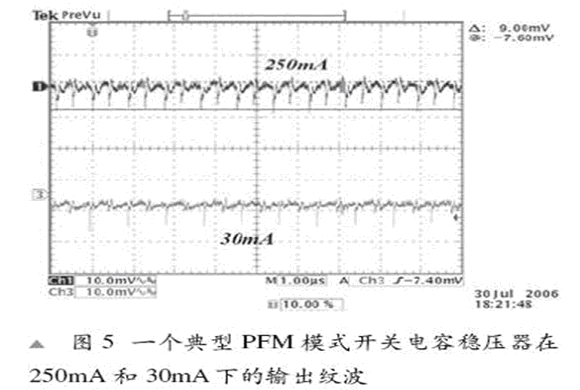 在PFM類系統(tǒng)中,可以感應到輸出電壓,當這個電壓高于一個指定值時,穩(wěn)壓器就會關閉,等到輸出電壓降到所需值以下時再重新開啟。使用PFM控制模式的缺點是工作頻率取于VIN 和 ILOAD ,因此變化不定。負載越高、工作頻率就越接近指定頻率。這個操作范圍上的頻率變化在一些便攜式應用中可能不大合適。輸入電壓紋波也取決于VIN 和 ILOAD。圖5顯示了250mA 和 30mA 負載的輸出紋波。10mF COUT 的輸出紋波將為50mV,我們可以看到250mA負載的紋波頻率高于10mA負載的紋波頻率。