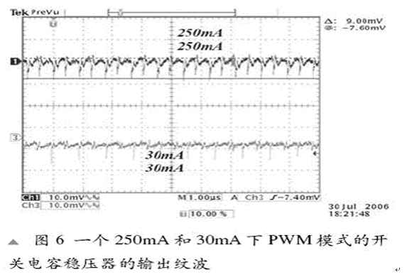 比較新的PWM調控模式處理了PFM架構中的各種頻率和高輸出紋波。大多數(shù)的新型開關電容穩(wěn)壓器都采用PWM調制模式。在這種模式下,功率FET的電阻根據(jù)VOUT 和 ILOAD進行控制。這樣做,我們就真正控制了快速電容器(CFLY)所提供的充電量。這也被稱為預調制。在這種模式下,操作頻率和工作周期都是固定的。一個PWM架構的例子是LM2771,圖6顯示出它的輸出紋波。它處于一個帶有4.7mF COUT 的8mV -10mV的順序中。我們可以看到在ILOAD變化的情況下紋波可以持續(xù)。一個9mV的紋波輸出可以與在感應開關穩(wěn)壓器中的紋波相媲美。