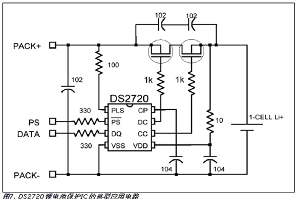 因?yàn)長(zhǎng)i+電池過(guò)充或過(guò)放可能會(huì)導(dǎo)致爆炸并造成人員傷害,所以使用這類電池時(shí),安全是主要關(guān)心的問(wèn)題。因此,商用鋰離子電池組通常包括象DS2720這樣的保護(hù)電路(圖7)。
