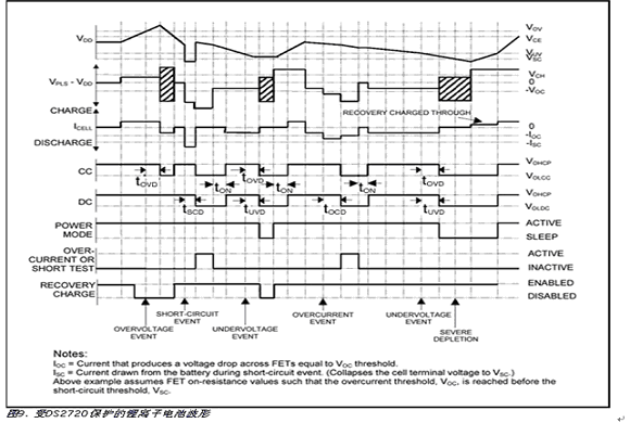 a 過(guò)壓 如果在VDD檢測(cè)的電池電壓超過(guò)過(guò)壓閾值VOV時(shí)間大于過(guò)壓延遲時(shí)間tOVD,則DS2720關(guān)閉充電FET,并將保護(hù)寄存器的OV置位。在過(guò)壓期間,放電通路保持開(kāi)放。除非被另外保護(hù)條件鎖定,當(dāng)電池電壓降到充電使能閾值VCE以下或由于放電導(dǎo)致VDD-VPLS>VOC時(shí),充電FET被重新使能。